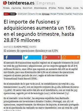 El mercado de transacciones español registró en el segundo trimestre de 2018 un total de 535 fusiones y adquisiciones, por un importe agregado de 28.876 millones de euros, unas cifras que suponen un aumento del 16% en el capital movilizado, pero una disminución del 6,8% en el número de operaciones respecto al mismo periodo de 2017, según el informe trimestral de Transactional Track Record (TTR).
