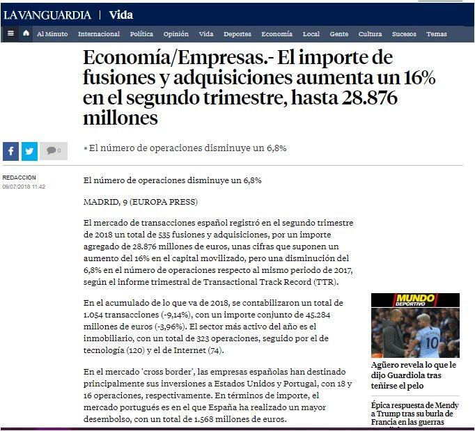 El mercado de transacciones español registró en el segundo trimestre de 2018 un total de 535 fusiones y adquisiciones, por un importe agregado de 28.876 millones de euros, unas cifras que suponen un aumento del 16% en el capital movilizado, pero una disminución del 6,8% en el número de operaciones respecto al mismo periodo de 2017, según el informe trimestral de Transactional Track Record (TTR).