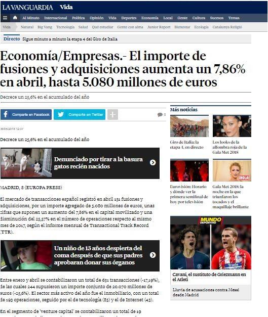 El mercado de transacciones español registró en abril 131 fusiones y adquisiciones, por un importe agregado de 5.080 millones de euros, unas cifras que suponen un aumento del 7,86% en el capital movilizado y una disminución del 25,57% en el número de operaciones respecto al mismo mes de 2017, según el informe mensual de Transactional Track Record (TTR).