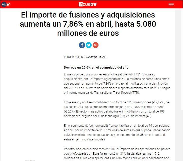 El mercado de transacciones español registró en abril 131 fusiones y adquisiciones, por un importe agregado de 5.080 millones de euros, unas cifras que suponen un aumento del 7,86% en el capital movilizado y una disminución del 25,57% en el número de operaciones respecto al mismo mes de 2017, según el informe mensual de Transactional Track Record (TTR).