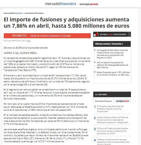 El mercado de transacciones español registró en abril 131 fusiones y adquisiciones, por un importe agregado de 5.080 millones de euros, unas cifras que suponen un aumento del 7,86% en el capital movilizado y una disminución del 25,57% en el número de operaciones respecto al mismo mes de 2017, según el informe mensual de Transactional Track Record (TTR).