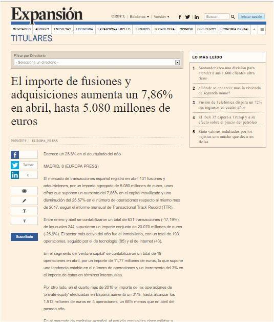 El mercado de transacciones español registró en abril 131 fusiones y adquisiciones, por un importe agregado de 5.080 millones de euros, unas cifras que suponen un aumento del 7,86% en el capital movilizado y una disminución del 25,57% en el número de operaciones respecto al mismo mes de 2017, según el informe mensual de Transactional Track Record (TTR).