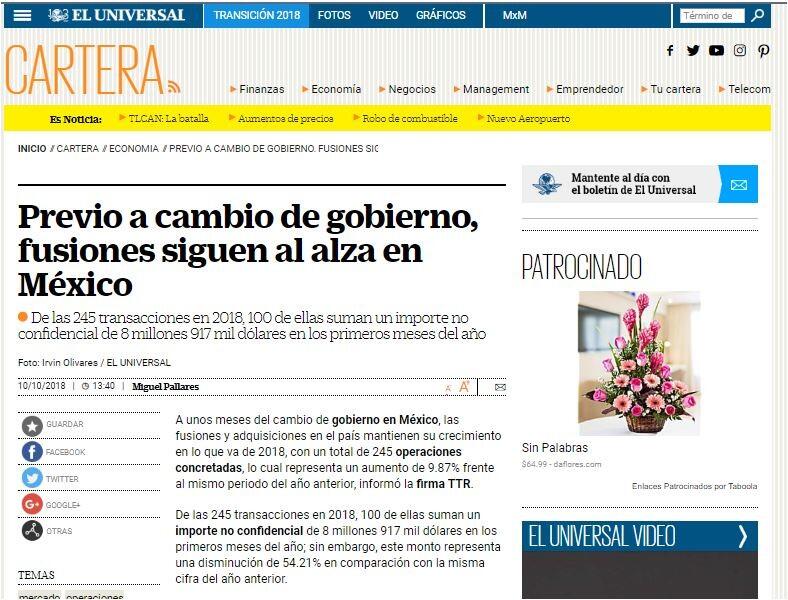A unos meses del cambio de gobierno en México, las fusiones y adquisiciones en el país mantienen su crecimiento en lo que va de 2018, con un total de 245 operaciones concretadas, lo cual representa un aumento de 9.87% frente al mismo periodo del año anterior, informó la firma TTR.