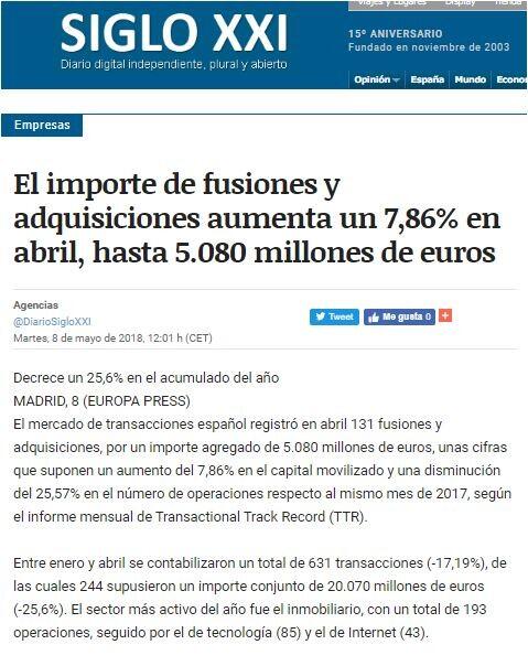 El mercado de transacciones español registró en abril 131 fusiones y adquisiciones, por un importe agregado de 5.080 millones de euros, unas cifras que suponen un aumento del 7,86% en el capital movilizado y una disminución del 25,57% en el número de operaciones respecto al mismo mes de 2017, según el informe mensual de Transactional Track Record (TTR).