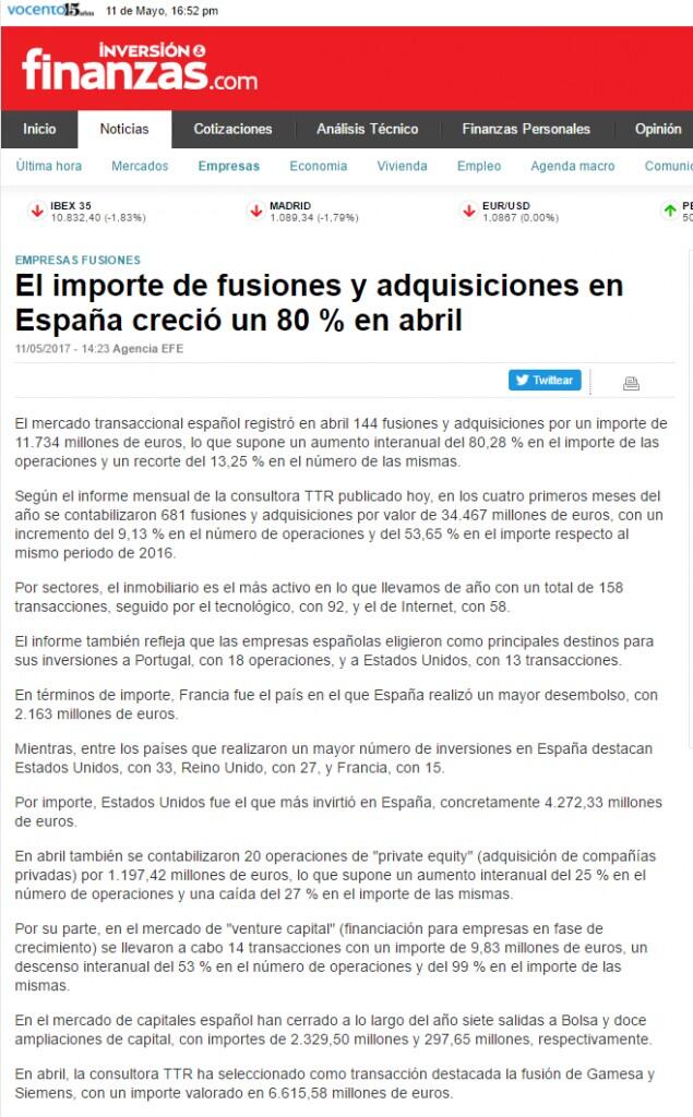 Según el informe mensual de la consultora TTR publicado hoy, en los cuatro primeros meses del año se contabilizaron 681 fusiones y adquisiciones por valor de 34.467 millones de euros, con un incremento del 9,13 % en el número de operaciones y del 53,65 % en el importe respecto al mismo periodo de 2016.