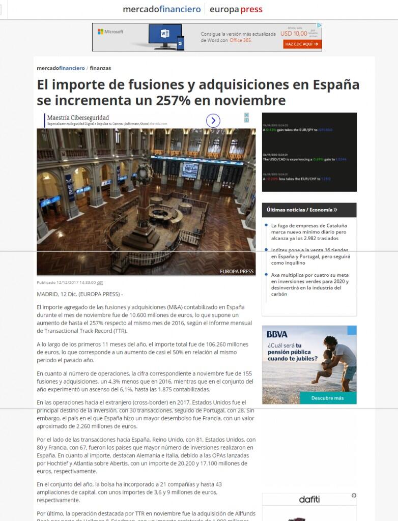 El importe agregado de las fusiones y adquisiciones (M&A) contabilizado en España durante el mes de noviembre fue de 10.600 millones de euros, lo que supone un aumento de hasta el 257% respecto al mismo mes de 2016, según el informe mensual de Transactional Track Record (TTR).