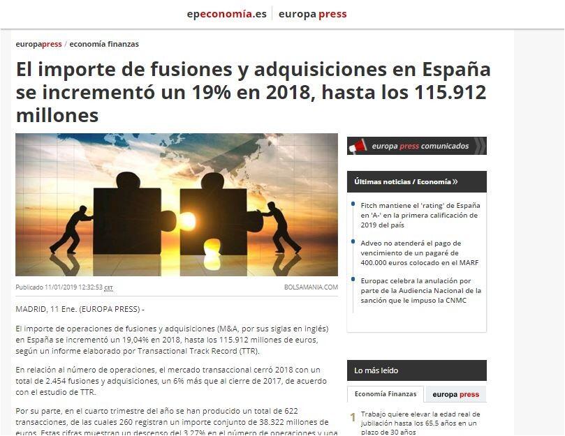 El importe de operaciones de fusiones y adquisiciones (M&A, por sus siglas en inglés) en España se incrementó un 19,04% en 2018, hasta los 115.912 millones de euros, según un informe elaborado por Transactional Track Record (TTR).