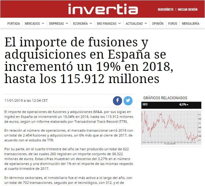 El importe de operaciones de fusiones y adquisiciones (M&A, por sus siglas en inglés) en España se incrementó un 19,04% en 2018, hasta los 115.912 millones de euros, según un informe elaborado por Transactional Track Record (TTR).