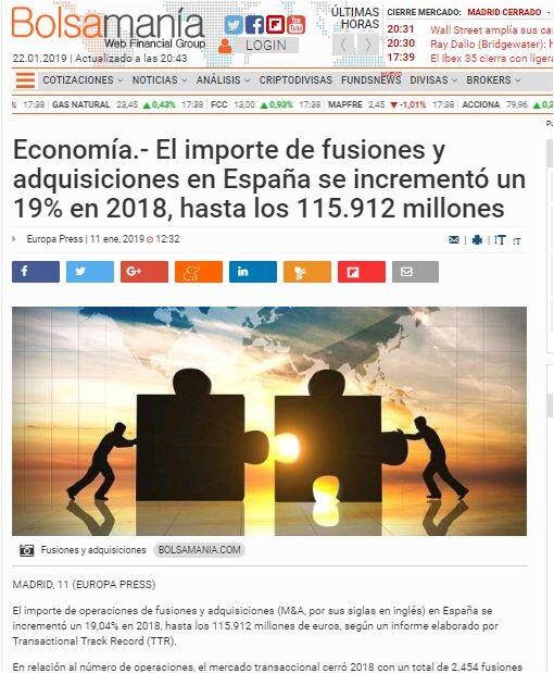 El importe de operaciones de fusiones y adquisiciones (M&A, por sus siglas en inglés) en España se incrementó un 19,04% en 2018, hasta los 115.912 millones de euros, según un informe elaborado por Transactional Track Record (TTR).