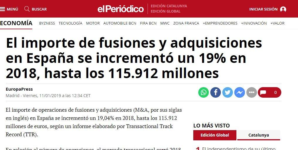 El importe de operaciones de fusiones y adquisiciones (M&A, por sus siglas en inglés) en España se incrementó un 19,04% en 2018, hasta los 115.912 millones de euros, según un informe elaborado por Transactional Track Record (TTR).