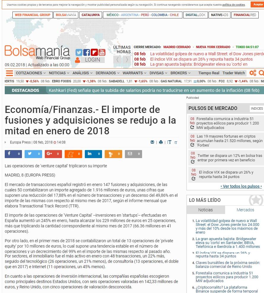 El mercado de transacciones español registró en enero 147 fusiones y adquisiciones, de las cuales 50 contabilizaron un importe agregado de 1.916 millones de euros, unas cifras que suponen una reducción del 17,88% en el número de transacciones y un descenso del 49,86% en el importe de las mismas con respecto al mismo mes de 2017, según el informe mensual que elabora Transactional Track Record (TTR).