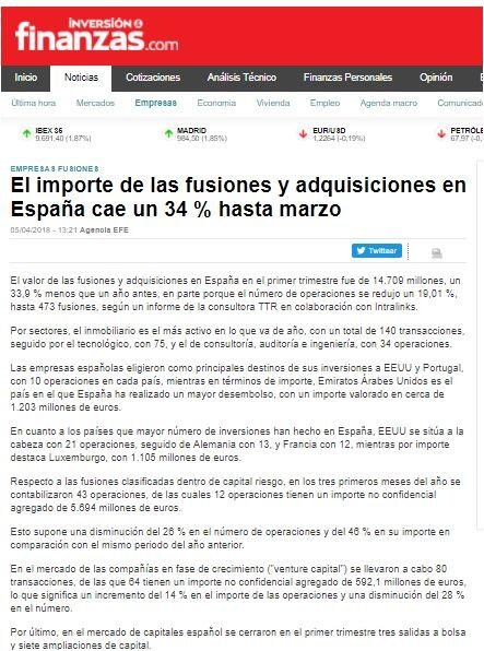El valor de las fusiones y adquisiciones en España en el primer trimestre fue de 14.709 millones, un 33,9 % menos que un año antes, en parte porque el número de operaciones se redujo un 19,01 %, hasta 473 fusiones, según un informe de la consultora TTR en colaboración con Intralinks.