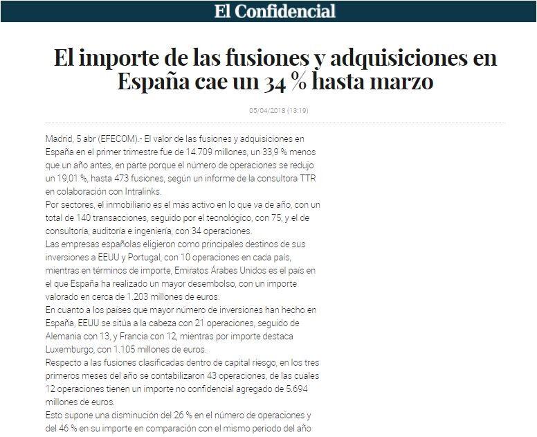 El valor de las fusiones y adquisiciones en España en el primer trimestre fue de 14.709 millones, un 33,9 % menos que un año antes, en parte porque el número de operaciones se redujo un 19,01 %, hasta 473 fusiones, según un informe de la consultora TTR en colaboración con Intralinks.