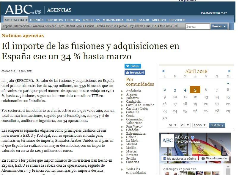 El valor de las fusiones y adquisiciones en España en el primer trimestre fue de 14.709 millones, un 33,9 % menos que un año antes, en parte porque el número de operaciones se redujo un 19,01 %, hasta 473 fusiones, según un informe de la consultora TTR en colaboración con Intralinks.