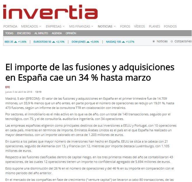 El valor de las fusiones y adquisiciones en España en el primer trimestre fue de 14.709 millones, un 33,9 % menos que un año antes, en parte porque el número de operaciones se redujo un 19,01 %, hasta 473 fusiones, según un informe de la consultora TTR en colaboración con Intralinks.