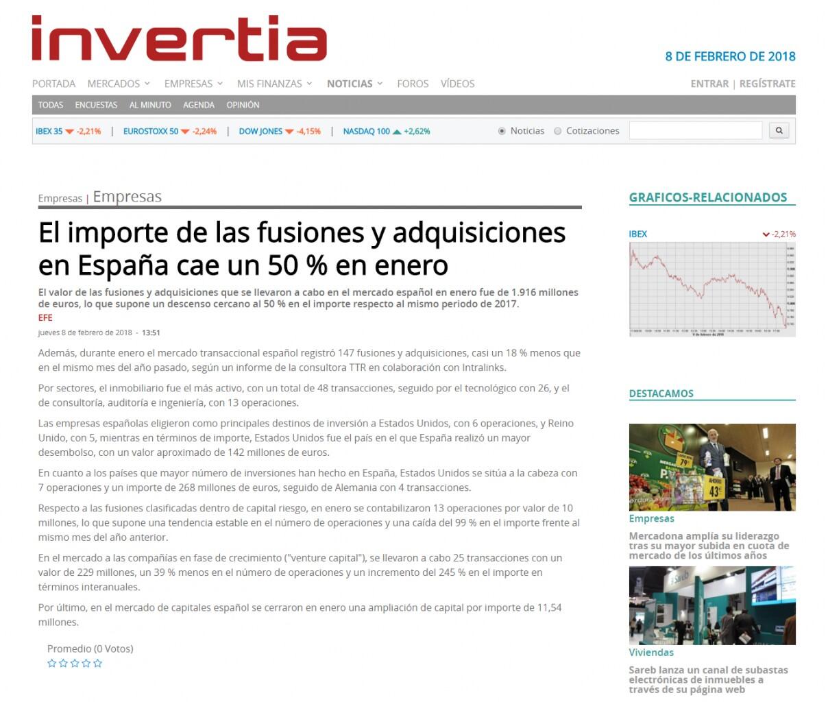 Además, durante enero el mercado transaccional español registró 147 fusiones y adquisiciones, casi un 18 % menos que en el mismo mes del año pasado, según un informe de la consultora TTR en colaboración con Intralinks.