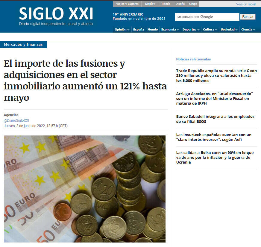 El importe de las fusiones y adquisiciones en el sector inmobiliario aumentó un 121% hasta mayo