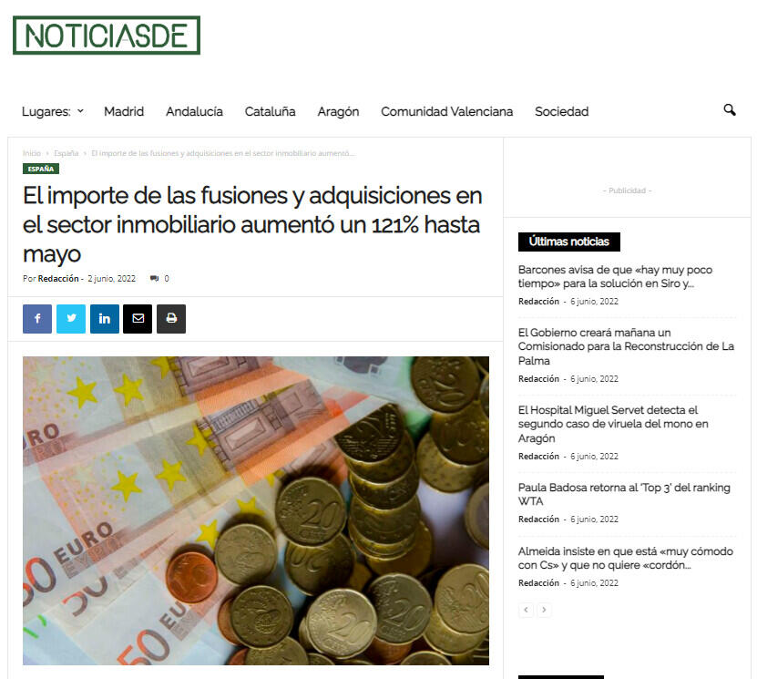 El importe de las fusiones y adquisiciones en el sector inmobiliario aumentó un 121% hasta mayo
