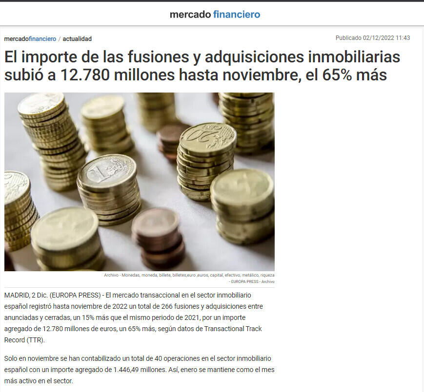 El mercado transaccional en el sector inmobiliario español registró hasta noviembre de 2022 un total de 266 fusiones y adquisiciones entre anunciadas y cerradas, un 15% más que el mismo periodo de 2021, por un importe agregado de 12.780 millones de euros, un 65% más, según datos de Transactional Track Record (TTR).