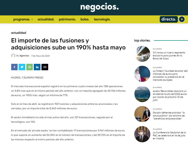 Solo en el mes de abril, se registraron 153 fusiones y adquisiciones entre las anunciadas y las cerradas, por un importe total de 8.242 millones de euros.