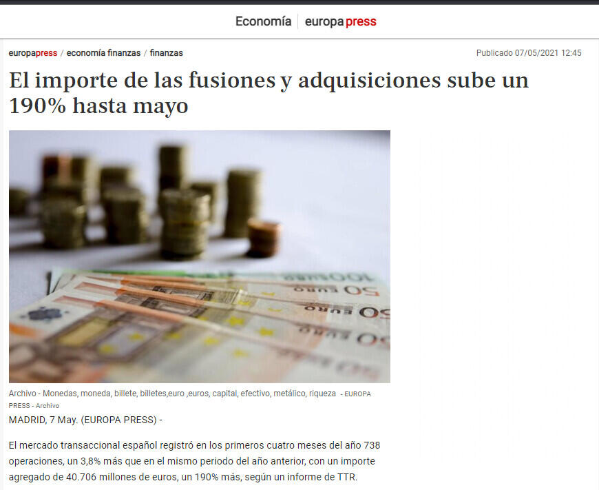 Solo en el mes de abril, se registraron 153 fusiones y adquisiciones entre las anunciadas y las cerradas, por un importe total de 8.242 millones de euros.