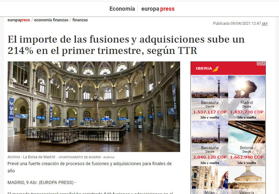 El mercado transaccional español ha registrado 540 fusiones y adquisiciones en el primer trimestre de 2021, lo que supone un 13,46% menos respecto al mismo periodo del año anterior, con un importe de 33.755 millones de euros, un 214% más.