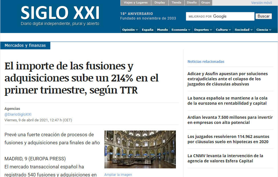 El mercado transaccional español ha registrado 540 fusiones y adquisiciones en el primer trimestre de 2021, lo que supone un 13,46% menos respecto al mismo periodo del año anterior, con un importe de 33.755 millones de euros, un 214% más.