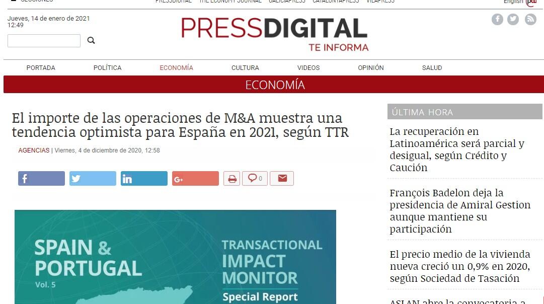 El mercado transaccional de fusiones y adquisiciones (M&A) refleja una tendencia optimista para España en 2021, según concluye la quinta edición del informe especial 'Transactional Impact Monitor: España y Portugal' elaborado por TTR.