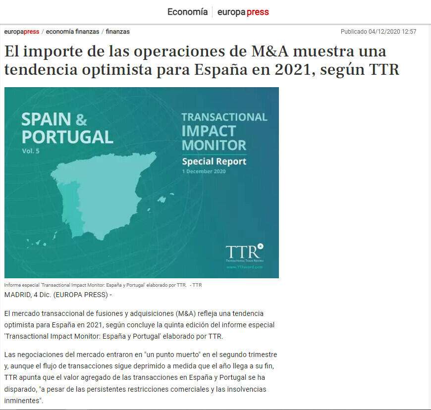 El mercado transaccional de fusiones y adquisiciones (M&A) refleja una tendencia optimista para España en 2021, según concluye la quinta edición del informe especial 'Transactional Impact Monitor: España y Portugal' elaborado por TTR.