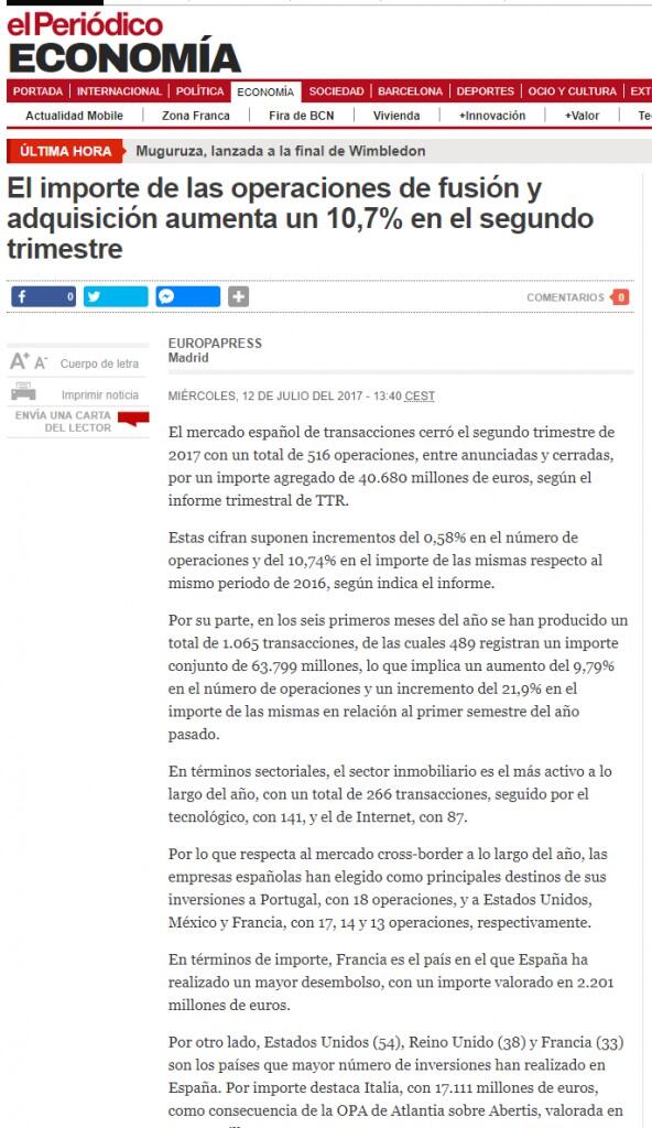 El mercado español de transacciones cerró el segundo trimestre de 2017 con un total de 516 operaciones, entre anunciadas y cerradas, por un importe agregado de 40.680 millones de euros, según el informe trimestral de TTR.