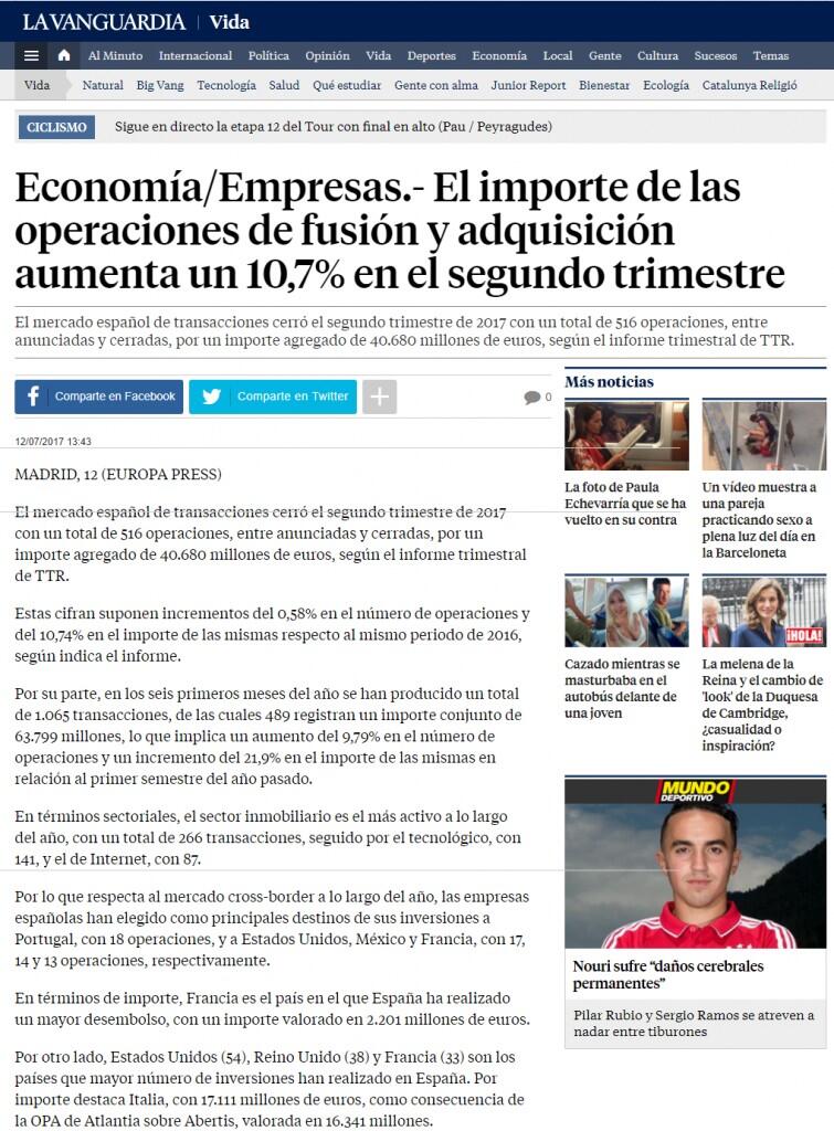 El mercado español de transacciones cerró el segundo trimestre de 2017 con un total de 516 operaciones, entre anunciadas y cerradas, por un importe agregado de 40.680 millones de euros, según el informe trimestral de TTR.