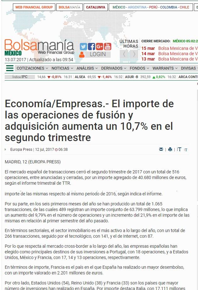 El mercado español de transacciones cerró el segundo trimestre de 2017 con un total de 516 operaciones, entre anunciadas y cerradas, por un importe agregado de 40.680 millones de euros, según el informe trimestral de TTR.