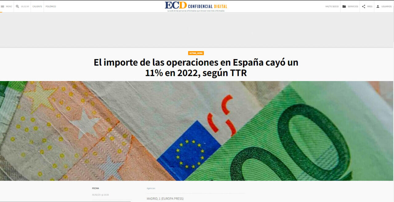 El importe de las operaciones en España cayó un 11% en 2022, según TTR