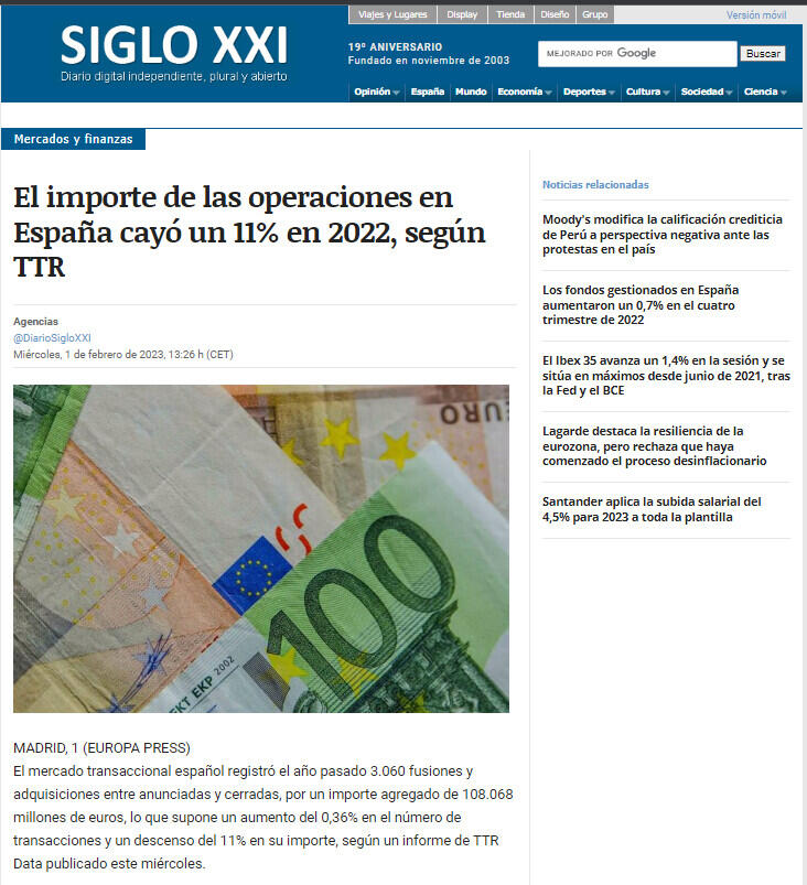 El importe de las operaciones en España cayó un 11% en 2022, según TTR