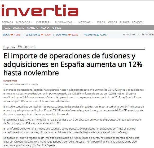 En el informe de noviembre, TTR ha seleccionado como transacción destacada la relacionada con Repsol, que ha cerrado la adquisición del negocio de bajas emisiones y la comercializadora de gas y electricidad de Viesgo.
