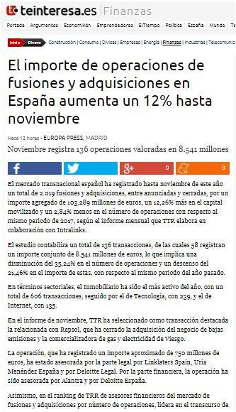 En el informe de noviembre, TTR ha seleccionado como transacción destacada la relacionada con Repsol, que ha cerrado la adquisición del negocio de bajas emisiones y la comercializadora de gas y electricidad de Viesgo.