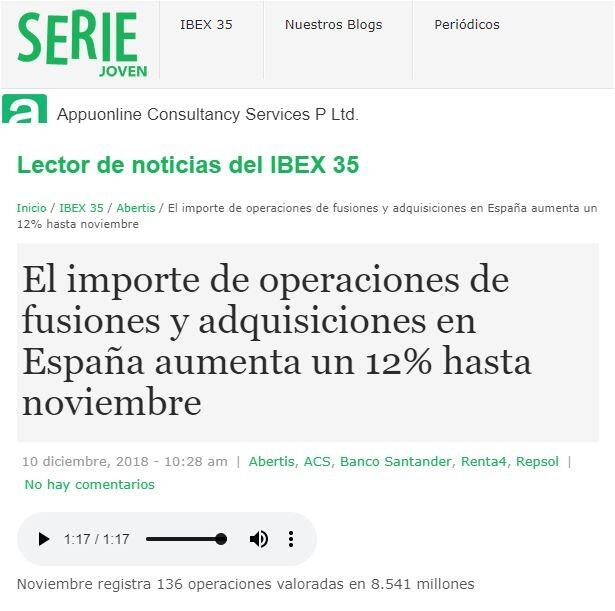 El importe de operaciones de fusiones y adquisiciones en Espaņa aumenta un 12% hasta noviembre