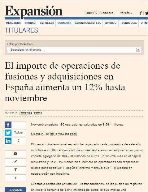 El mercado transnacional español ha registrado hasta noviembre de este año un total de 2.019 fusiones y adquisiciones, entre anunciadas y cerradas, por un importe agregado de 103.289 millones de euros, un 12,26% más en el capital movilizado y un 2,84% menos en el número de operaciones con respecto al mismo periodo de 2017, según el informe mensual que TTR elabora en colaboración con Intralinks.