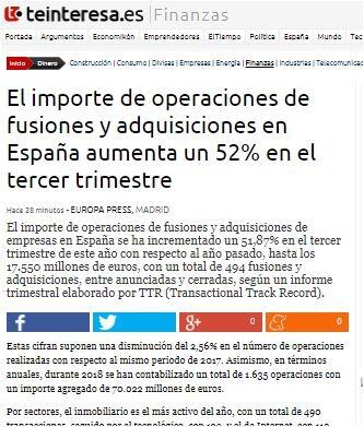 El importe de operaciones de fusiones y adquisiciones de empresas en España se ha incrementado un 51,87% en el tercer trimestre de este año con respecto al año pasado, hasta los 17.550 millones de euros, con un total de 494 fusiones y adquisiciones, entre anunciadas y cerradas, según un informe trimestral elaborado por TTR (Transactional Track Record).