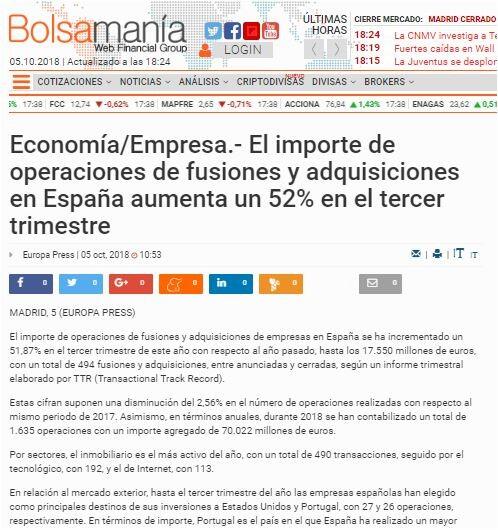 El importe de operaciones de fusiones y adquisiciones de empresas en España se ha incrementado un 51,87% en el tercer trimestre de este año con respecto al año pasado, hasta los 17.550 millones de euros, con un total de 494 fusiones y adquisiciones, entre anunciadas y cerradas, según un informe trimestral elaborado por TTR (Transactional Track Record).