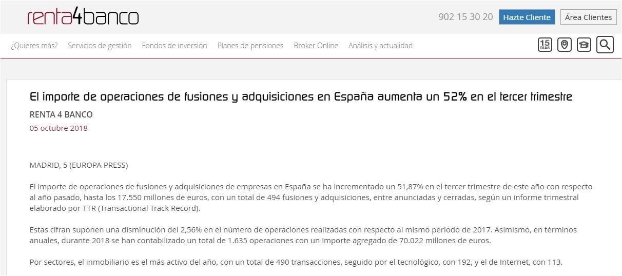 El importe de operaciones de fusiones y adquisiciones de empresas en España se ha incrementado un 51,87% en el tercer trimestre de este año con respecto al año pasado, hasta los 17.550 millones de euros, con un total de 494 fusiones y adquisiciones, entre anunciadas y cerradas, según un informe trimestral elaborado por TTR (Transactional Track Record).