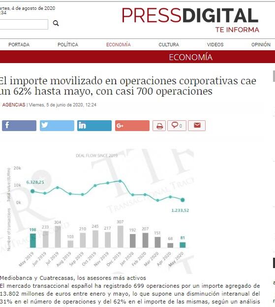 De estas, el mercado de fusiones y adquisiciones ('M&A', por sus siglas inglés) ha contabilizado 286 operaciones, entre anunciadas y cerradas, por un total de 7.982 millones de euros en dicho periodo. En mayo se produjeron 81 operaciones de 'M&A' por 1.233 millones de euros, a pesar de los desafíos logísticos del estado de alarma.