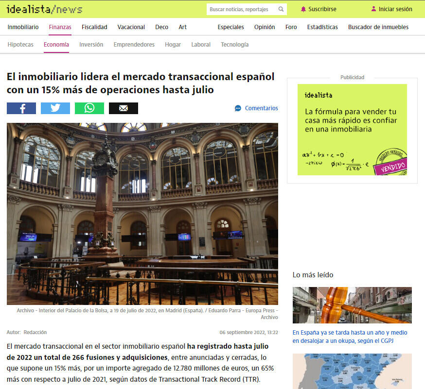 El mercado transaccional en el sector inmobiliario español ha registrado hasta julio de 2022 un total de 266 fusiones y adquisiciones, entre anunciadas y cerradas, lo que supone un 15% más, por un importe agregado de 12.780 millones de euros, un 65% más con respecto a julio de 2021, según datos de Transactional Track Record (TTR).