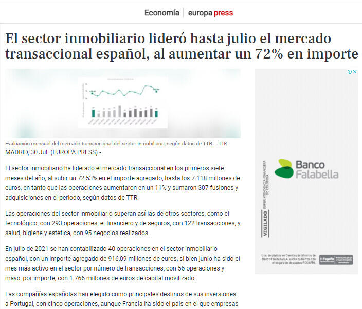 En julio de 2021 se han contabilizado 40 operaciones en el sector inmobiliario español, con un importe agregado de 916,09 millones de euros, si bien junio ha sido el mes más activo en el sector por número de transacciones, con 56 operaciones y mayo, por importe, con 1.766 millones de euros de capital movilizado.