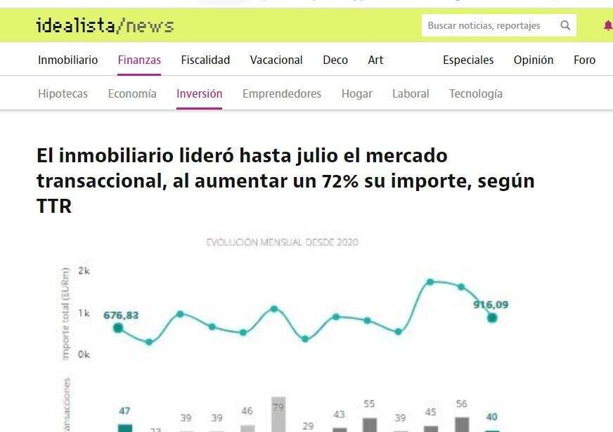 En julio de 2021 se han contabilizado 40 operaciones en el sector inmobiliario español, con un importe agregado de 916,09 millones de euros, si bien junio ha sido el mes más activo en el sector por número de transacciones, con 56 operaciones y mayo, por importe, con 1.766 millones de euros de capital movilizado.