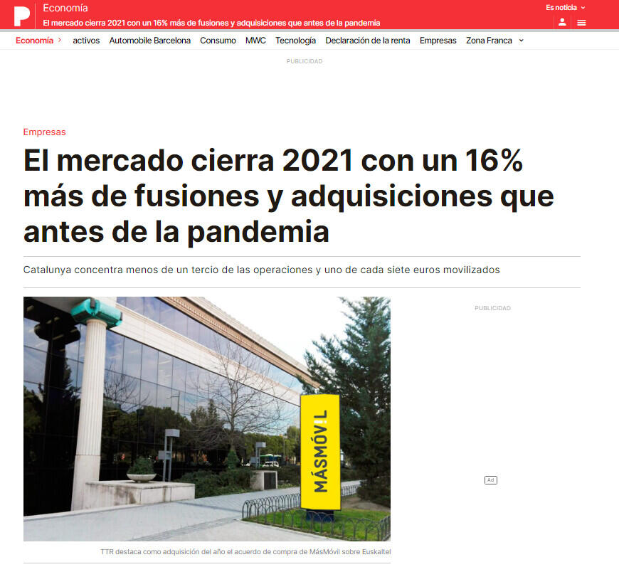 Las operaciones de fusión y adquisición están en auge. Después del pequeño retroceso registrado el año del estallido de la pandemia, el mercado empresarial español termina 2021 con cerca de 3.000 transacciones de este tipo, un 25% más que un año atrás y, a su vez, un 15,9% por encima de los niveles previos al covid. Así lo muestra el informe anual elaborado por la plataforma estadística TTR, que señala asimismo que el volumen de las operaciones es cada vez mayor.