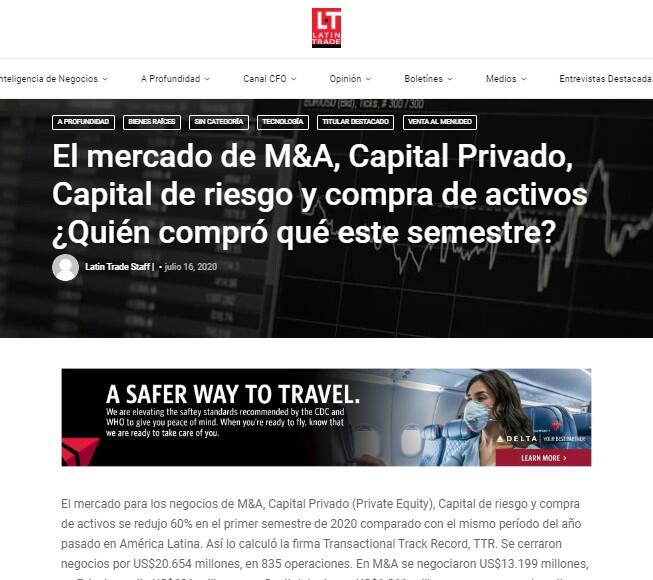 El mercado para los negocios de M&A, Capital Privado (Private Equity), Capital de riesgo y compra de activos se redujo 60% en el primer semestre de 2020 comparado con el mismo período del año pasado en América Latina. Así lo calculó la firma Transactional Track Record, TTR. Se cerraron negocios por US$20.654 millones, en 835 operaciones. En M&A se negociaron US$13.199 millones, en Private equity US$681 millones, en Capital de riesgo US$1.211 millones y en compra de activos, US$5.564 millones.