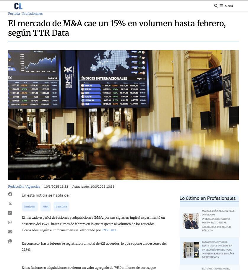 El mercado español de fusiones y adquisiciones (M&A, por sus siglas en inglés) experimentó un descenso del 15,4% hasta el mes de febrero en lo que respecta al volumen de los acuerdos alcanzados, según el informe mensual elaborado por TTR Data.