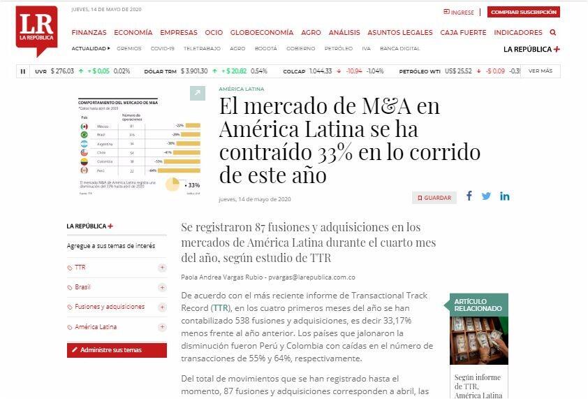 De acuerdo con el más reciente informe de Transactional Track Record (TTR), en los cuatro primeros meses del año se han contabilizado 538 fusiones y adquisiciones, es decir 33,17% menos frente al año anterior. Los países que jalonaron la disminución fueron Perú y Colombia con caídas en el número de transacciones de 55% y 64%, respectivamente.