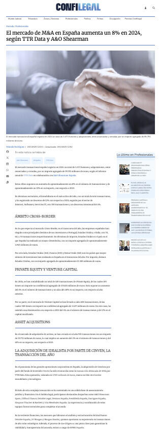 El mercado de M&A en España aumenta un 8% en 2024, según TTR Data y A&O Shearman